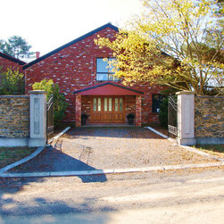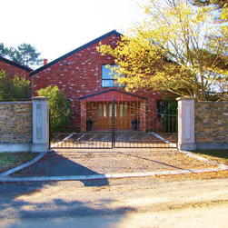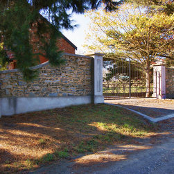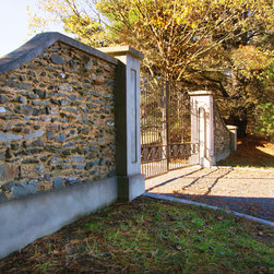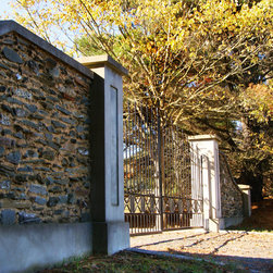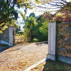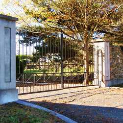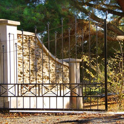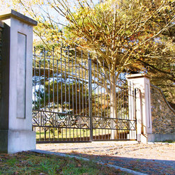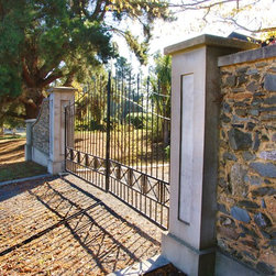 The gate entrance spans 25 meters wide and combines traditional sand cement rendered pillars and natural stones, sourced locally from within the estate. Custom Iron Gates offers both security and esthetics to the property.