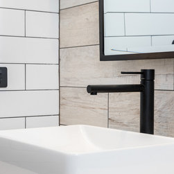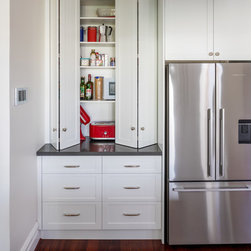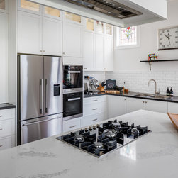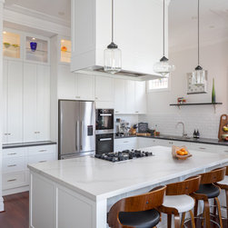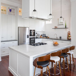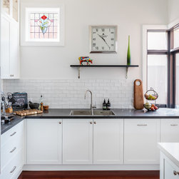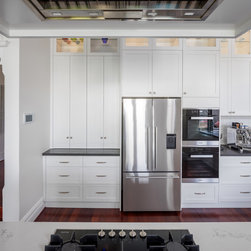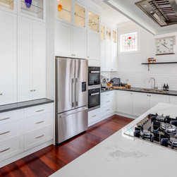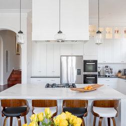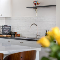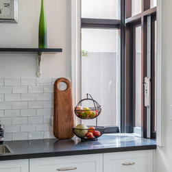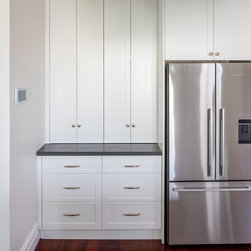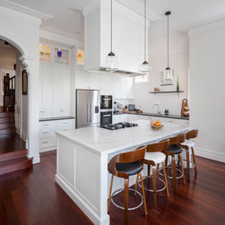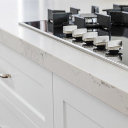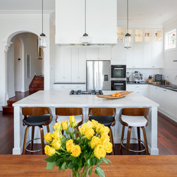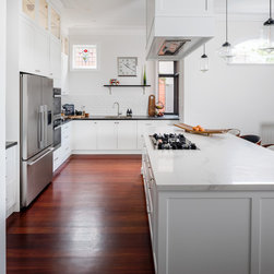 Benchtops: Caesarstone with 40mm edges; Statuario Maximus for the island and Raven against the walls - fabricated by CASA Stoneworks.