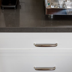 Handles are Decade in Polished Nickel by Castella Architectural Hardware: knob 210.035.28 and handle 208.152.28.