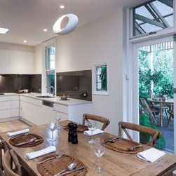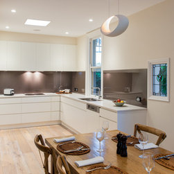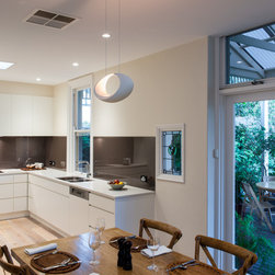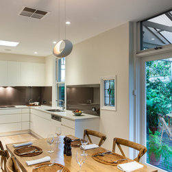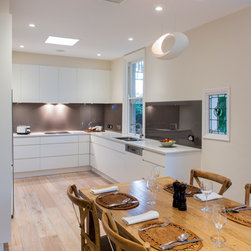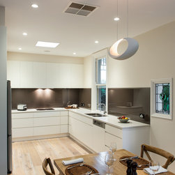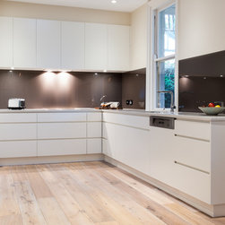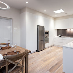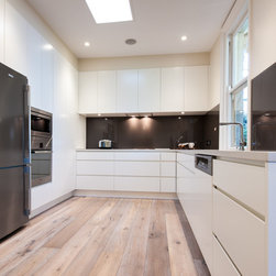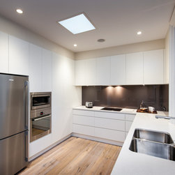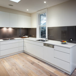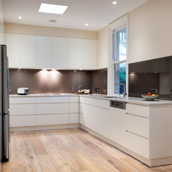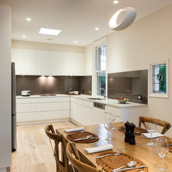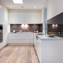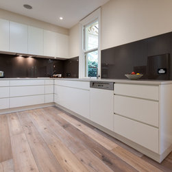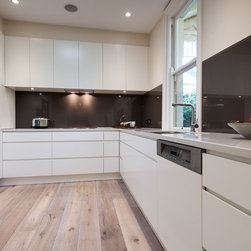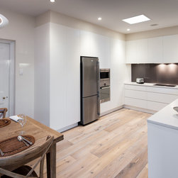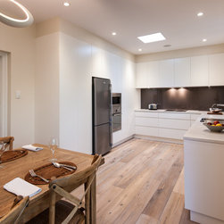 Success with this design came from our minimalist approach, turning a narrow kitchen into a space that feels much larger. A sweeping Laminex Freestyle benchtop, white cabinetry and clean lines come together in a simple U-shaped design to create a social space. The owners desired ample yet discreet storage, so we built drawers inside the pantry cupboard, an integrated bin drawer and a concealed appliance cabinet with bi-fold doors to keep the surfaces clutterfree. LED under-cabinet lighting accentuates the length of the cabinetry, giving the perception of space. In stunning contrast to the minimalist style, white washed oak flooring brings depth to the room with a rustic feel in keeping with the furnishings.