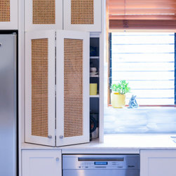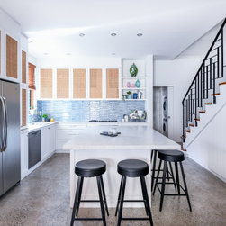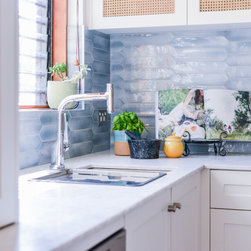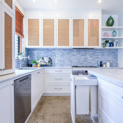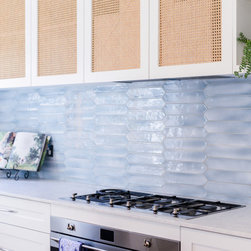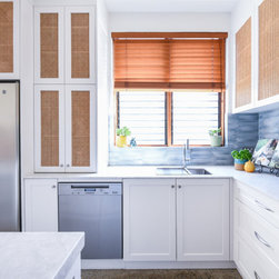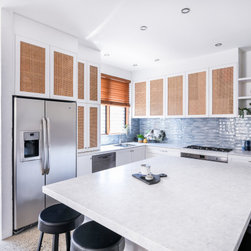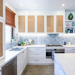 Coastal Rattan Kitchen | Blue Tiled Splash back | Under Stair Storage