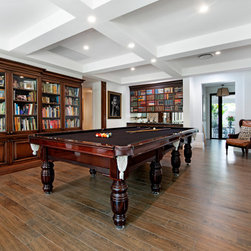 Billiard room with timber floors and bookcases