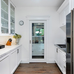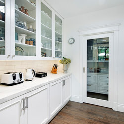 Butlers Pantry with glass doors and subway tile