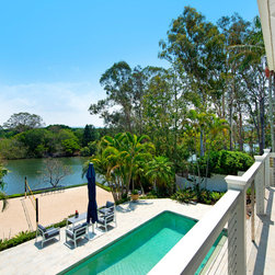 Balcony overlooking pool and Beach volley ball court on waterfront