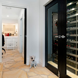 Stainless steel wine racks with solid timber doors and stone floor