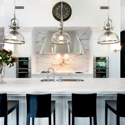White kitchen with marble countertops and pendant lights