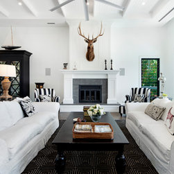 Black and White Living Room with high ceilings and fireplace.