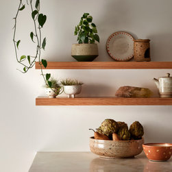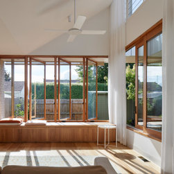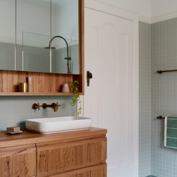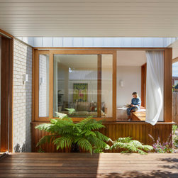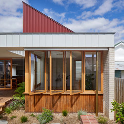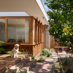 We reprogrammed the original floorplan to marry each room with its best functional match – allowing an enhanced flow of the home, while liberating budget for the extension’s shared spaces. Though modestly proportioned, the new communal areas are smoothly functional, rich in materiality, and tailored to our clients’ passions. Shielding the house’s rear from harsh western sun, a covered deck creates a protected threshold space to encourage outdoor play and interaction with the garden.