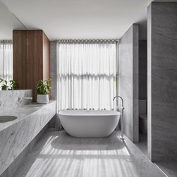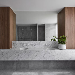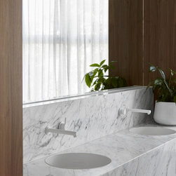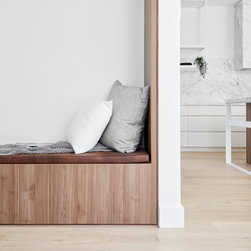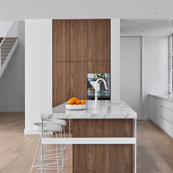 At the heart of the home, beyond the feature staircase, you will find an immaculate kitchen built by TKDC, complete with Carrara marble surfaces, V-Zug appliances, integrated Whispair rangehood and integrated Fisher & Paykel fridge. The Australian-made Scala tapware and Franke sinks carry on the white-on-white theme from the façade, telling a story of light and space. Caramel-toned cabinetry in Notaio Walnut Woodmatt by Polytec is fitted with soft-close hinges by Blum and finger pulls, create a handleless solution for sleek, uninterrupted design. An impressive butler’s pantry, chic built-in bench seat and easy access to the laundry provide comfort of use and standout modern design.