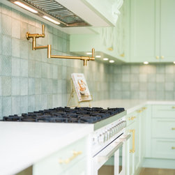 Traditional charm meets modern luxury ? This timeless green kitchen features sophisticated gold hardware for a touch of opulence. Every luxurious detail has been thought out, from the soft-closing magnetic drawers, a bespoke oven for your culinary creations, and a generous wine rack to complement.