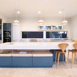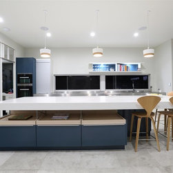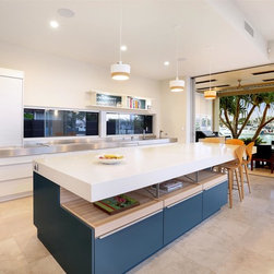 KAV lights with American Oak trim look right in place in this stunning residency project in the Sunshine Coast. The white ceramic works well with the Caesarstone bench top and the Oak perfectly match the breakfast stools.
