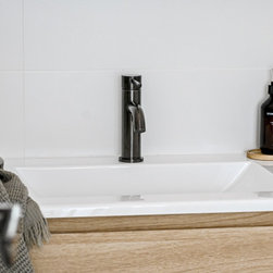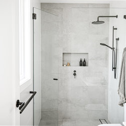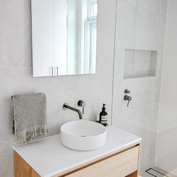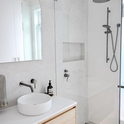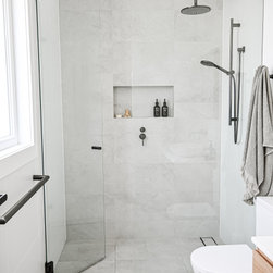 Contemporary | Bench Seat | Thin Shaker | Floating Shelves | Grey Stone Bathroom