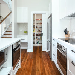 Our design team listened to our clients and created a modern open plan shaker-style kitchen & butler’s pantry with a designated nook in the kitchen for their cat.