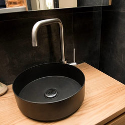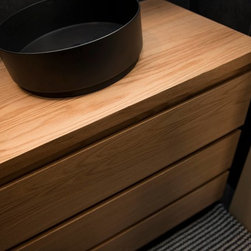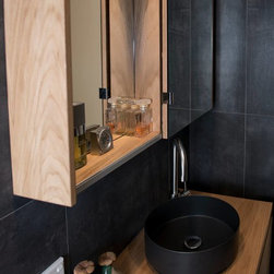 This sumptuous bathroom clearly demonstrates that bathroom spaces, in particular, need not always look 'light and bright'. The dark tones used here help to create a 'cozy cave-effect', a personal retreat where you can enjoy some much needed 'me time'. The warmth of the light timber vanity so perfectly contrasted with the black basin, all work together to make for a 'hotel' style bathroom where pampering the user is the main goal.