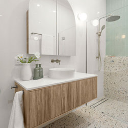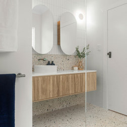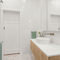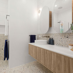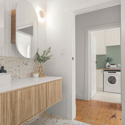 The renovated bathroom, laundry and ensuite maintain a unified theme with terrazzo porcelain tiles, oak elements, and carefully chosen pistachio and white feature tiles creating a contemporary and visually connected ambience.