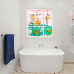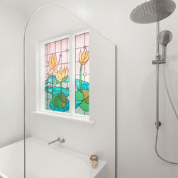 In our approach to the second bathroom, our focus was on ease of maintenance with a contemporary style. Our strategy began with the installation of floor-to-ceiling tiles, providing a durable and easy-to-clean surface. Adjacent, we kept a separate WC complete with its own washbasin, prioritising privacy and efficiency. To preserve the bathroom’s original character, we refurbished the stained-glass windows, meticulously restoring the frames, making this charming lotus flower motif window a captivating feature within the space.