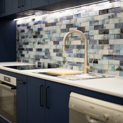 Contemporary blue kitchen that uses an artistic blue tile splashback and silver tapware