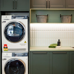 Contemporary laundry featuring green cabinetry and modern laundry appliances