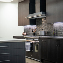 Contemporary black kitchen with dark grey tile splashback and silver hardware