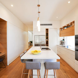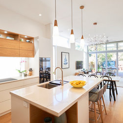 Contemporary Kitchen | High Ceilings | Open Shelving | Built-In Study Desk