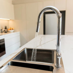 Clean lines, elegantly understated looks and clever use of space, make this contemporary kitchen a clear winner on all fronts. Note the walk-in pantry, cleverly designed to maximise the use of the corner area. Large comfortable drawers, plenty of storage and perfect placement of appliances ensure to the functionality of this space. The use of a stunning marble look benchtop adds a touch of luxury to the whole.