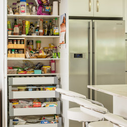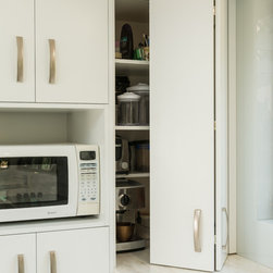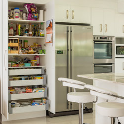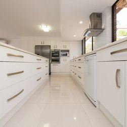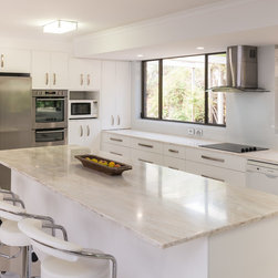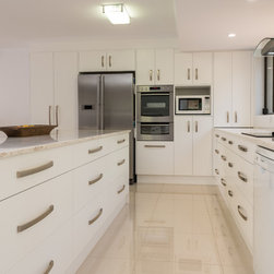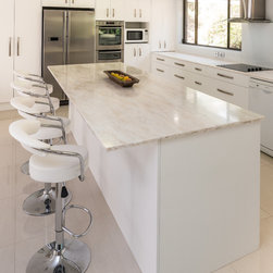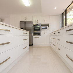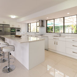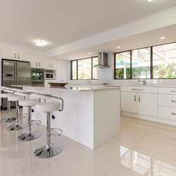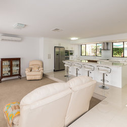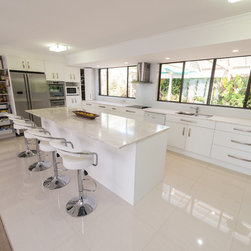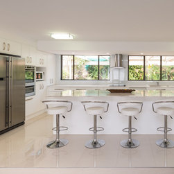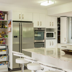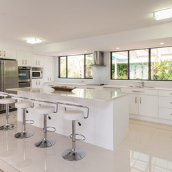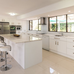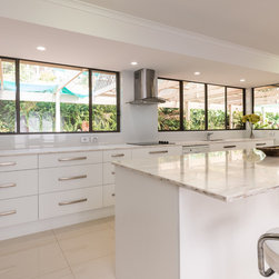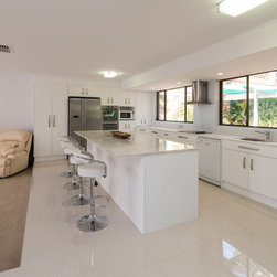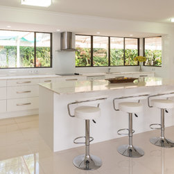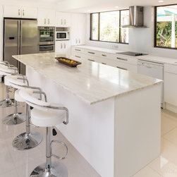 This white open space kitchen is a natural part to the living space. Lots of practical storage and ample work space make this kitchen a joy to use.