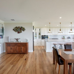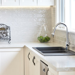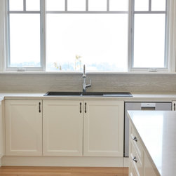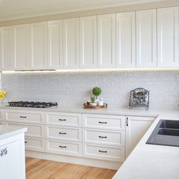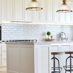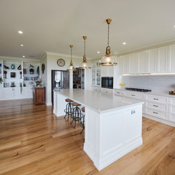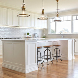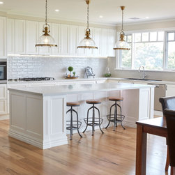 The heart of the home is the kitchen, and this stunning kitchen will see many family & friends get togethers with it's #ceasarstone London Grey bench tops cojavascript:;mplimented by #Blum 2Pac white panel press closing cupboard doors and large self closing pot draws with rustic grey handles. Grey wavey tiles #Designertile draws this spectacular kitchen together, beautiful black Blanco double sink and tapware. Pendant lights with brass and glass over this beautiful kitchen bench top.#bathtimebathrooms