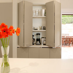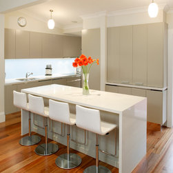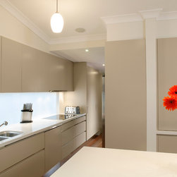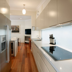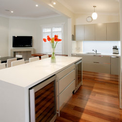 Tired of their former dark and pokey kitchen, the owners of this Cremorne kitchen enlisted the help of Art of Kitchens to brighten up the living space. This was achieved in a number of ways, most notably through the addition of an innovative custom-made splashback that runs the length of the cooking bench illuminating the space in natural light. Photos by Eliot Cohen
