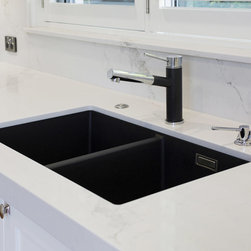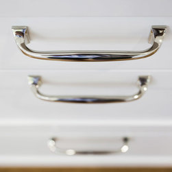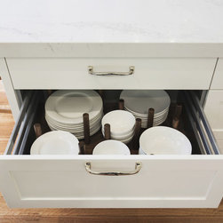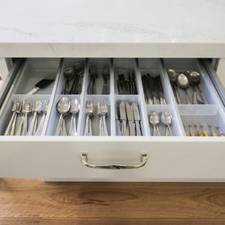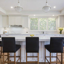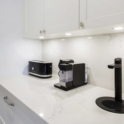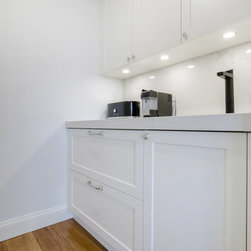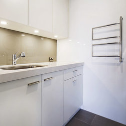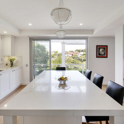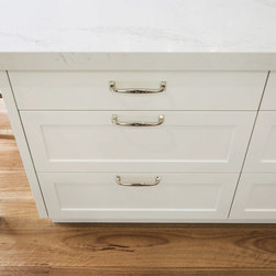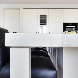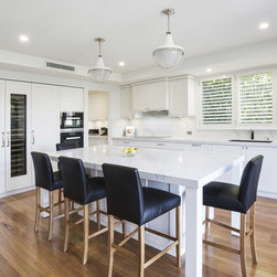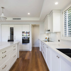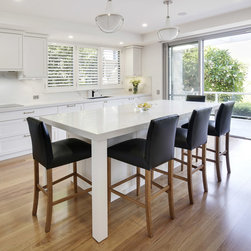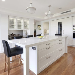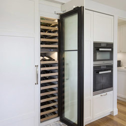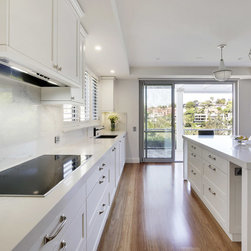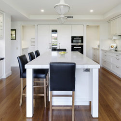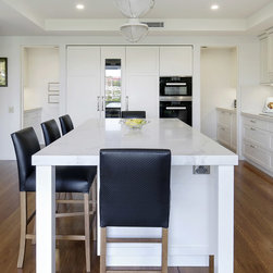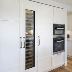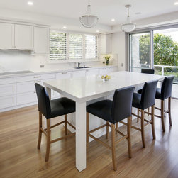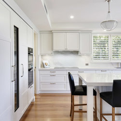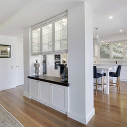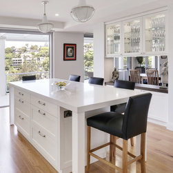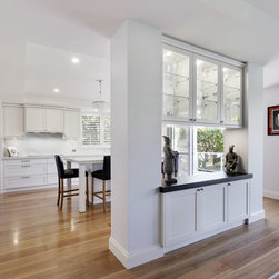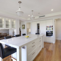 The kitchen has been opened to the living space with the removal of a wall. A glass display unit now acts as a privacy screen between the two spaces. All the joinery is made in shaker style. Tall cabinets and appliances (ovens, wine storage and refrigerator) have been built flush into the wall maximising usable space within the kitchen. The island was designed with legs at four corners to give the appearance of a table while retaining the functionality of an island. Large polished nickel handles add to the sense of luxury.