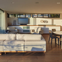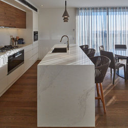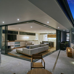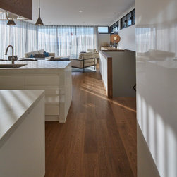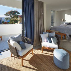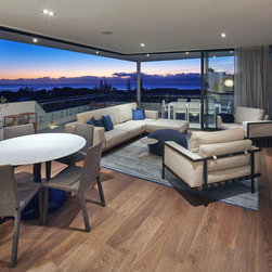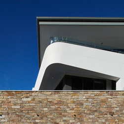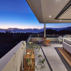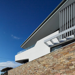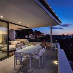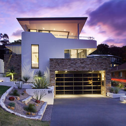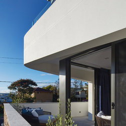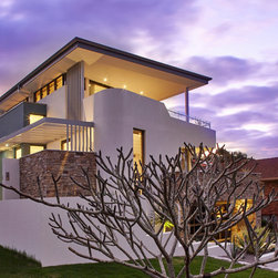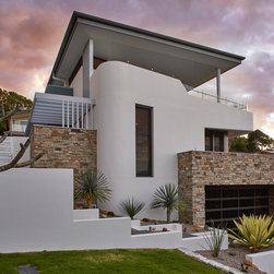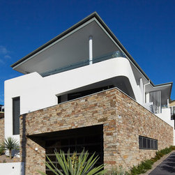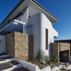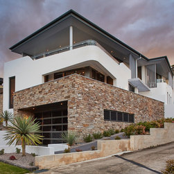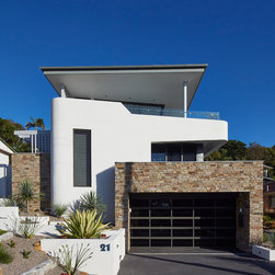 This townhouse development in Lennox Head has been designed to function either as separate holiday units or one large dwelling. The dynamic street facade appears as a single integrated development, and references the fluid movement of the world class point break it overlooks. The pared back, low maintenance landscaping and white washed facades also harkens back to the architecture of the Greek islands - an early reference from the client.
