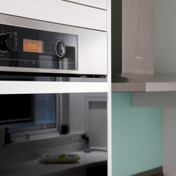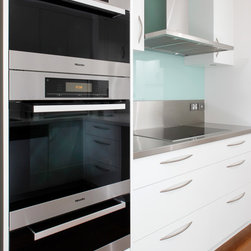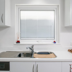 Short matching stone splashbacks on window side - combination steel and glass splashback behind cooktop.