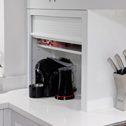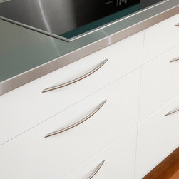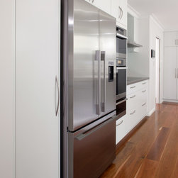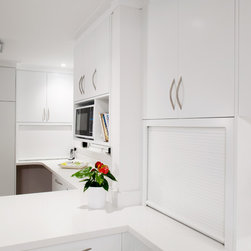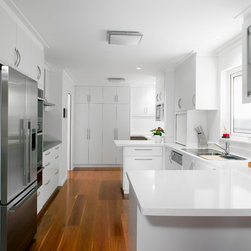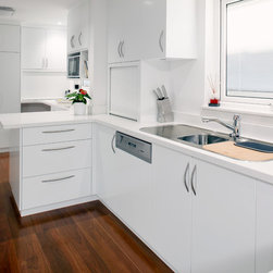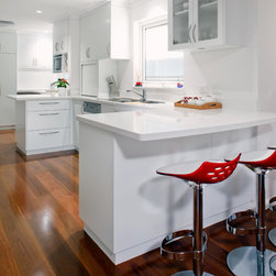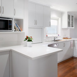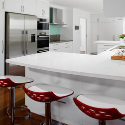 Benches in Caesarstone Organic White, and stainless steel on cooktop side.