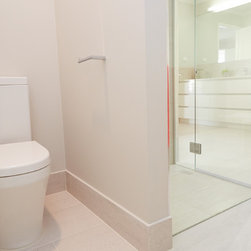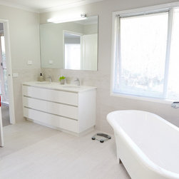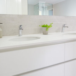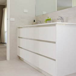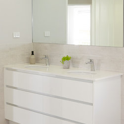 Italian tapware sparkles throughout the room. The double hand basins grace the top of a custom-made vanity unit. The screen on the on the walk-in shower was custom designed and made as well.