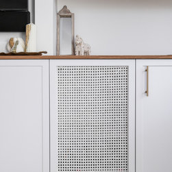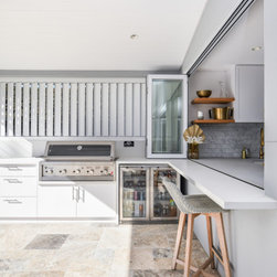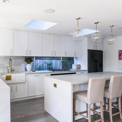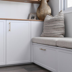 Our team diligently collaborated with our clients and their builder to craft a modern, coastal shaker-profile kitchen featuring seamlessly integrated appliances and ingenious storage solutions.