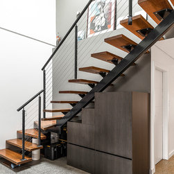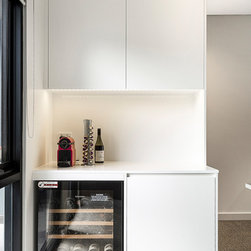 Dark Under Stair Joinery | Bar with Wine Fridge | Timber Benchtop Office with St