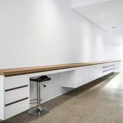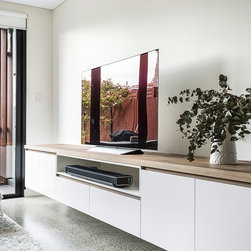 Our design team listened to our clients and created modern custom joinery for their ground floor including an extra-long desk-storage, TV unit, kitchenette and under stairs storage.