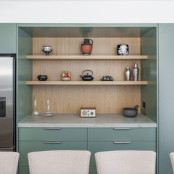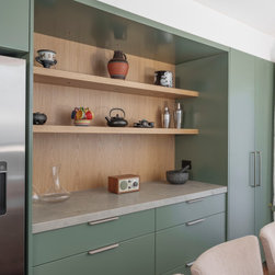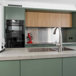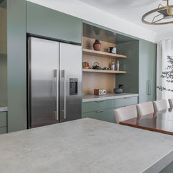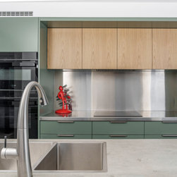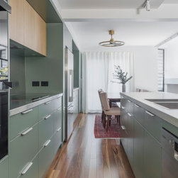A tower stack of ovens replaced the old underbench configuration for improved ergonomics, while a discreetly ducted rangehood now vents externally, improving air quality. Visually, the kitchen reflects the clients’ personalities—modern, bold, and slightly industrial. Rich green cabinetry, textured concrete-look benchtops, and oak accents come together in a sophisticated palette. The finished result is a practical and character-filled space that brings new life to this inner-city home.