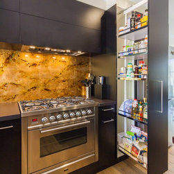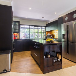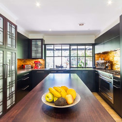 Designer, Corey Johnson, created a stunning Japanese inspired kitchen for this client in Diamond Creek. While it’s intense, dark colour is strong, it’s finishes and simplicity bring a soft edge to this humble home. The striking timber of the feature doors and island benchtop offer integrity to the completed space while the gold painted glass splashback boasts of authenticity.