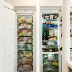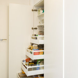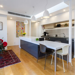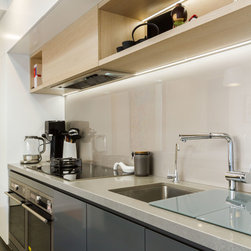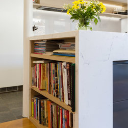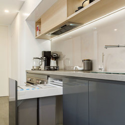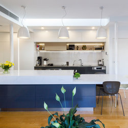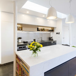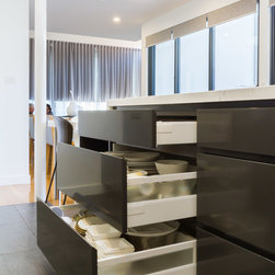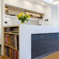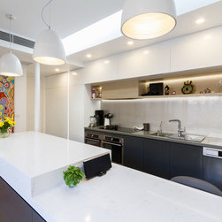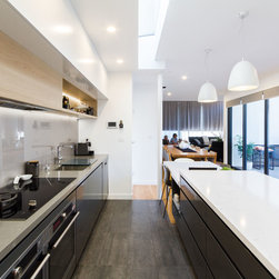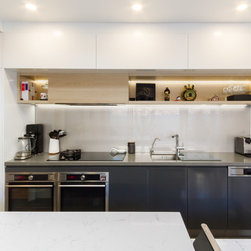 A sleek, modern kitchen with integrated appliances makes for a seamless, high-end feel. Designer, Daniel Spargo, has brought his clients' dream to life with a stunning marble-look benchtop, 2pac cabinets and timber-look laminate feature shelving. Everything is within spinning distance making cooking in this kitchen a breeze!