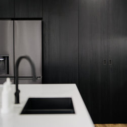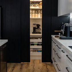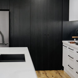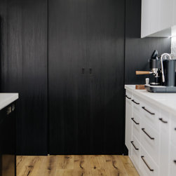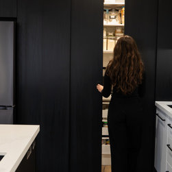 The design thoughtfully incorporates a walk-in pantry, concealed behind an all-black timber sliding door for sleekness.