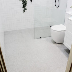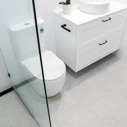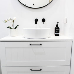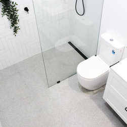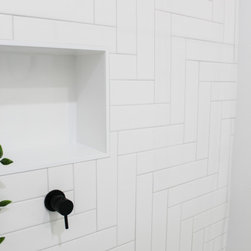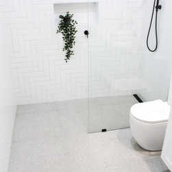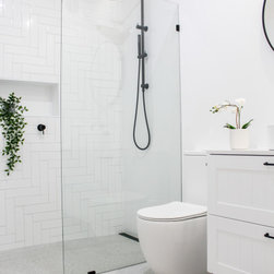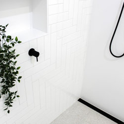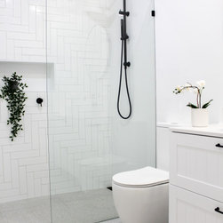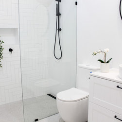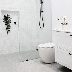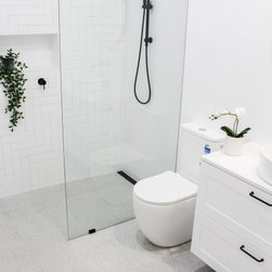 Walk In Shower, All In A Row Shower Set Up, On the Ball Bathrooms Set Up, Hampton Vanity, Modern Bathroom Feature Wall, Black On White Bathroom.