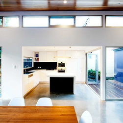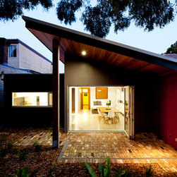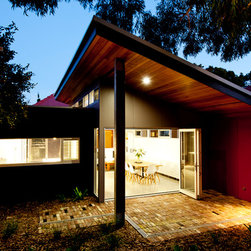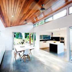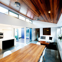 Drummoyne house additions & alterations project created a series of new living spaces opening to a revitalized garden centered on a giant eucalypt. A courtyard separates new from old and allows northern light into the heart of the original house. A new palette of operable glazed walls, cedar lined ceilings, polished concrete floors and recycled brick paving gives the new spaces a strong contrast to the refurbished rooms of the old house - each reinforces the best qualities of the other. A Ned Kelly slot window from the kitchen focuses the gaze the eucalypt and native understorey winning over mown lawn – such is life.