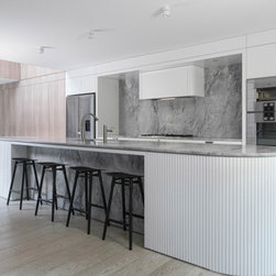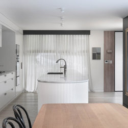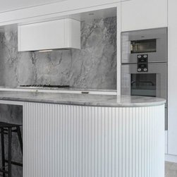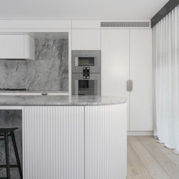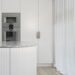 Working within the existing kitchen footprint, the Dan Kitchens team reconfigured the layout for greater efficiency and flow. The design took cues from the home’s architectural language: large rounded voids, minimalist forms, vertical steel cladding, and a neutral palette of concrete greys and crisp whites. These influences informed a series of custom details, handcrafted in the Dan Kitchens workshop—including fluted panelling, curved island ends, and a bespoke rangehood box.