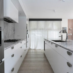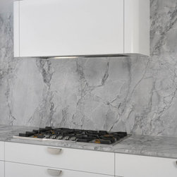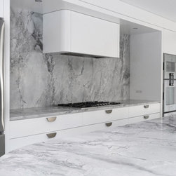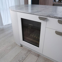 The centrepiece, a long sculptural island clad in Super White Dolomite, anchors the space with quiet luxury. Gaggenau appliances complete the picture of refined functionality. Installed entirely by Dan Kitchens’ in-house team, the result is a seamless integration between kitchen and home - modern, restrained, and enduring.