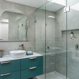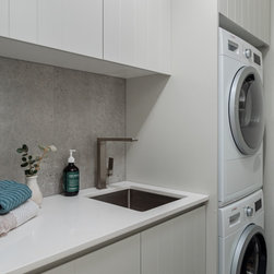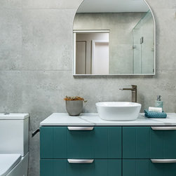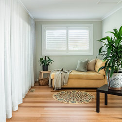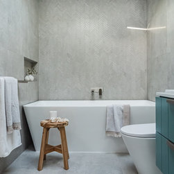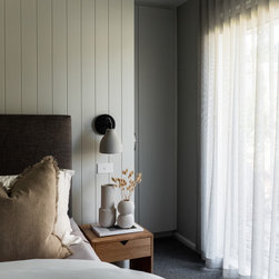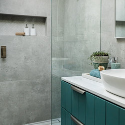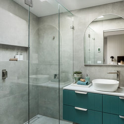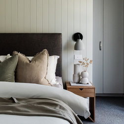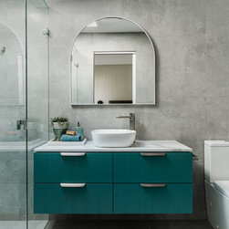 After viewing an inspirational image online, the vision for this project was crystal clear. Warm grey stone lappato tiles with matching feature mosaics nominated behind the freestanding bath and within the shower niches created an instant feeling of tranquil sophistication. Custom designed vanities specified in a beautiful deep sea green with vgroove detail, brushed nickel tapware throughout and curved lines within the basin and feature mirrors inherit a timeless, coherent look. With the final addition of vgroove lining boards, 100% wool carpet and soft window treatments, the interior of this home has been transformed into a blissful and relaxed haven for our clients.