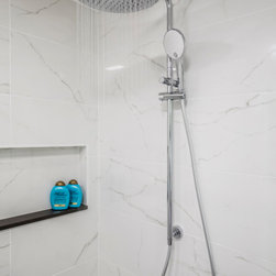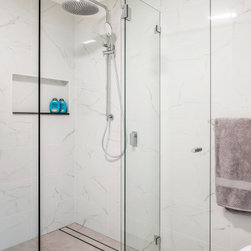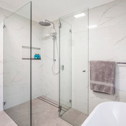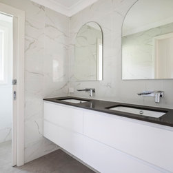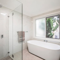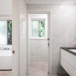 A subtle and soothing colour palette is enriched by the marble-look tiles and warm grey of the floor tiles. The freestanding bath under the window is luxurious addition and makes for a tempting bath experience.