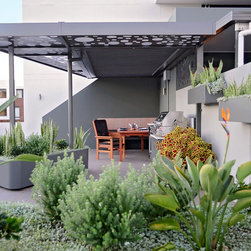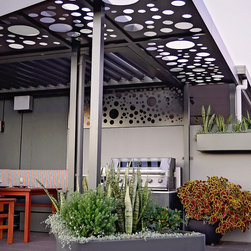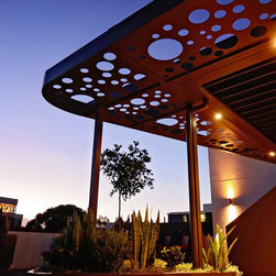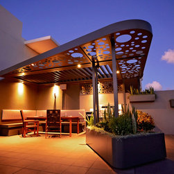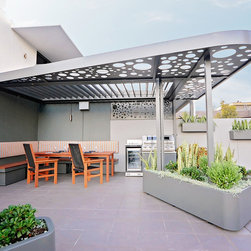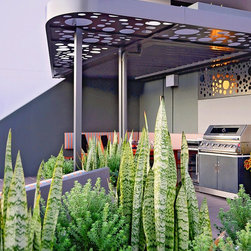 This amazing penthouse balcony space was hot, exposed and never used. So the focus was to create a destination point that offers a place of shelter to dine and entertain or just sit and take in city views with a glass of bubbles and watch the sun go down. It’s modern, clean and crisp with a visual sense of unity with the rest of the apartment. The materials used are lightweight, allowing for site weight restrictions, constructed off site and installed in a matter of days.