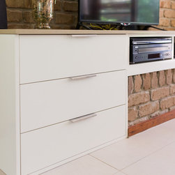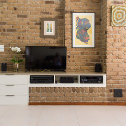 Finally, custom cabinetry was fitted around the brickwork to create a modern media unit.