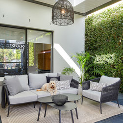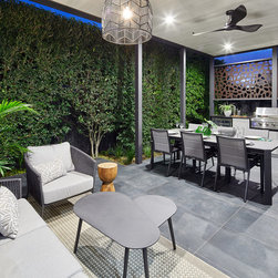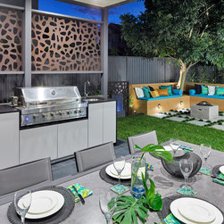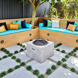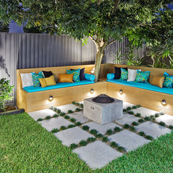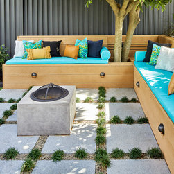 The outdoor pergola was demolished, and a new outdoor room featured Out Deco decorative screens and Gloss wood pre finished timber lining boards, was constructed to provide space for relaxing, cooking and dining. The garden was re-landscaped to include an L-shaped seating arrangement with a paved area and fire pit – the perfect addition for larger gatherings. The former clothes line was removed and relocated to maximise the space and a new lawn was laid to add softness and comfort to the outdoors. A large, existing tree was retained to provide shade to the garden and new perimeter planting softens the surrounding fence line and adds more greenery to the space.