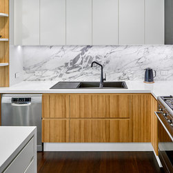The new dining room area windows were replaced with St James Whitting Ebonize coloured French doors, which now lead out from the dining room to the new entertaining space. The closed-in kitchen is now open-plan, providing a family-friendly cooking, eating and entertaining space with functional storage facilities. Materials include Silestone benchtops, natural marble splashbacks, natural timber veneer joinery and stainless-steel tapware and appliances; all selected for their eco-friendly attributes including zero-VOC paints from the St James Whitting Elementals Collection coloured by Resene Paints for the interior and exterior scheme.